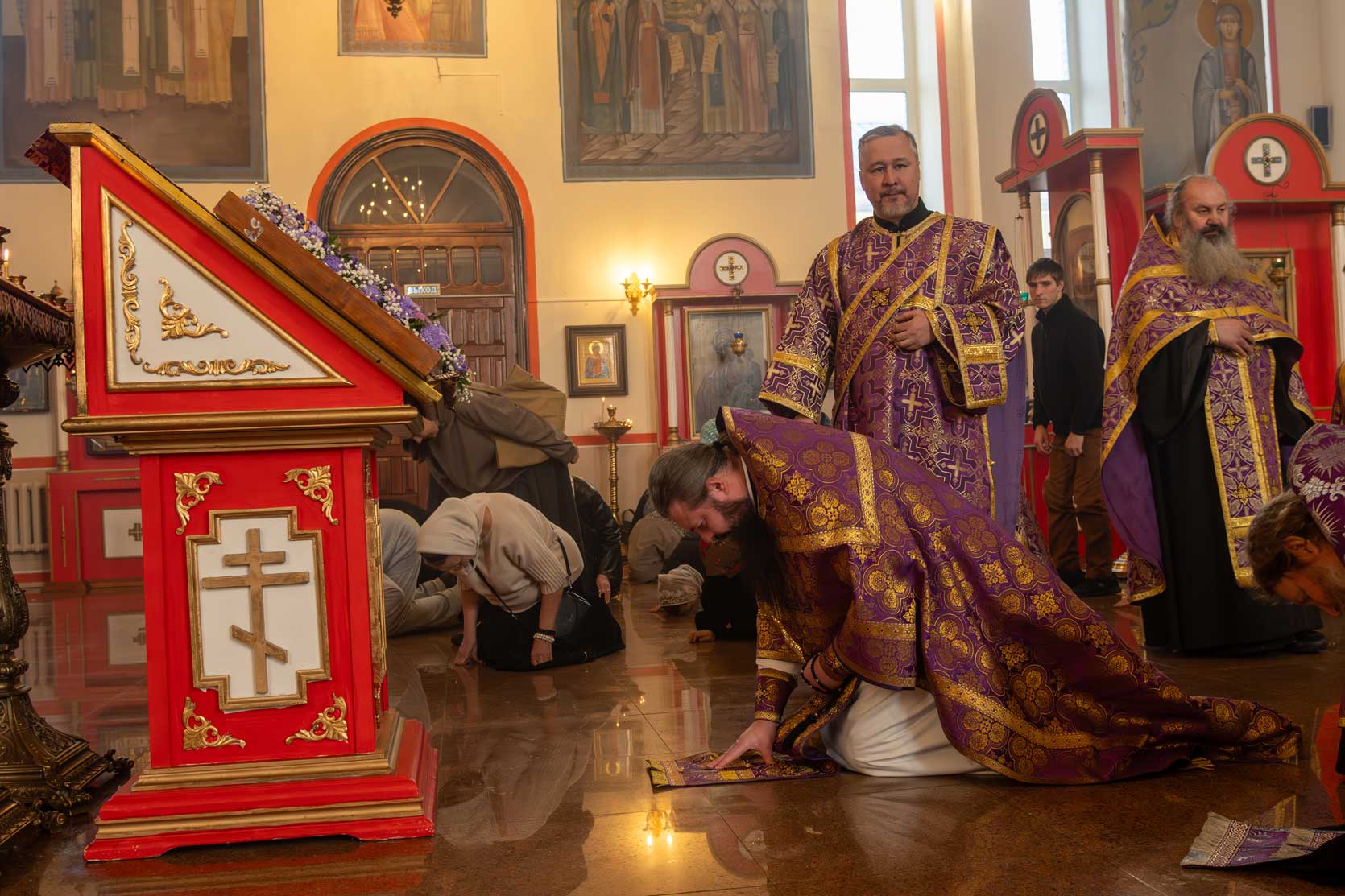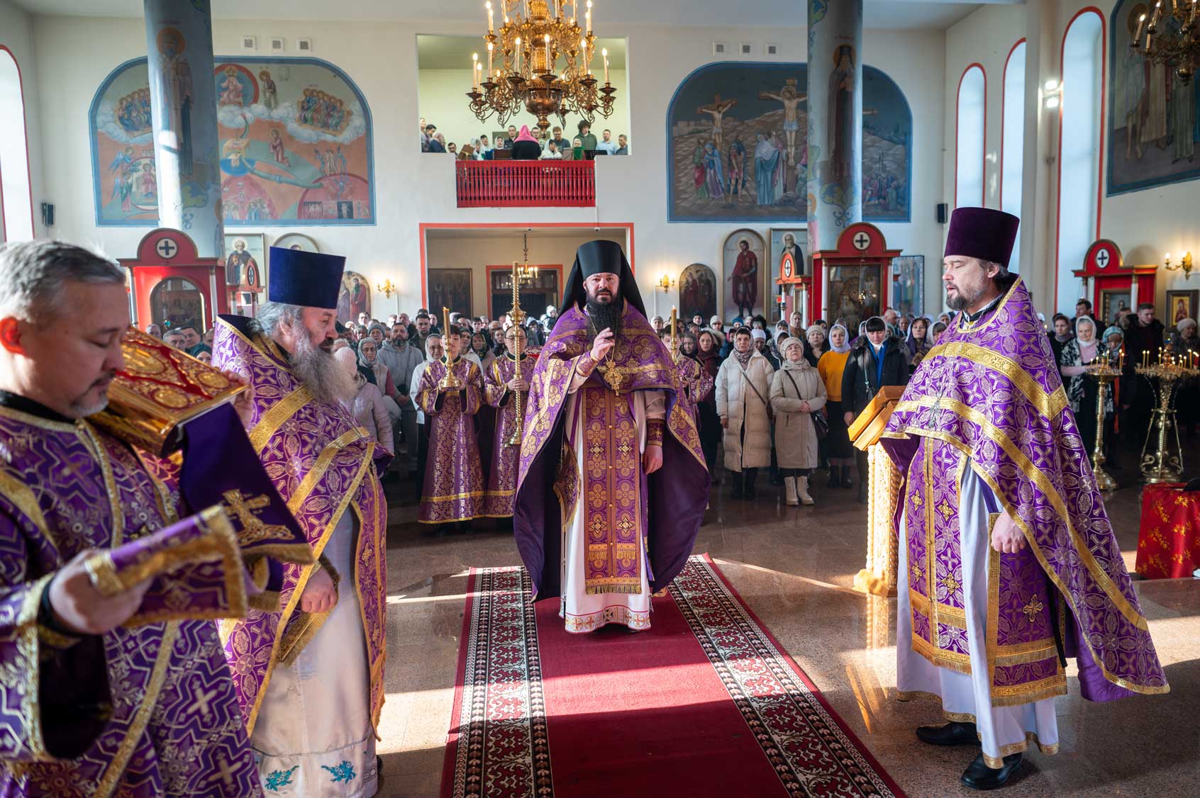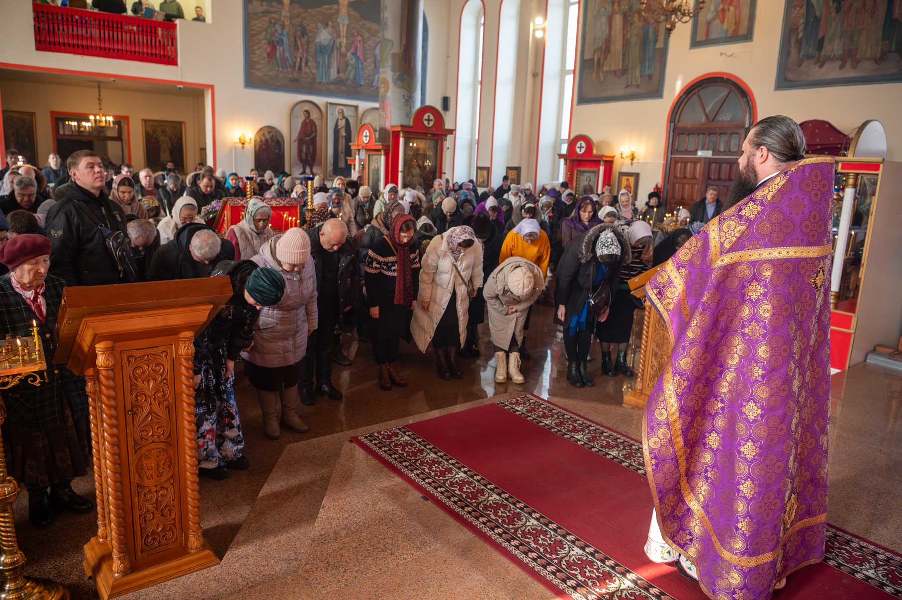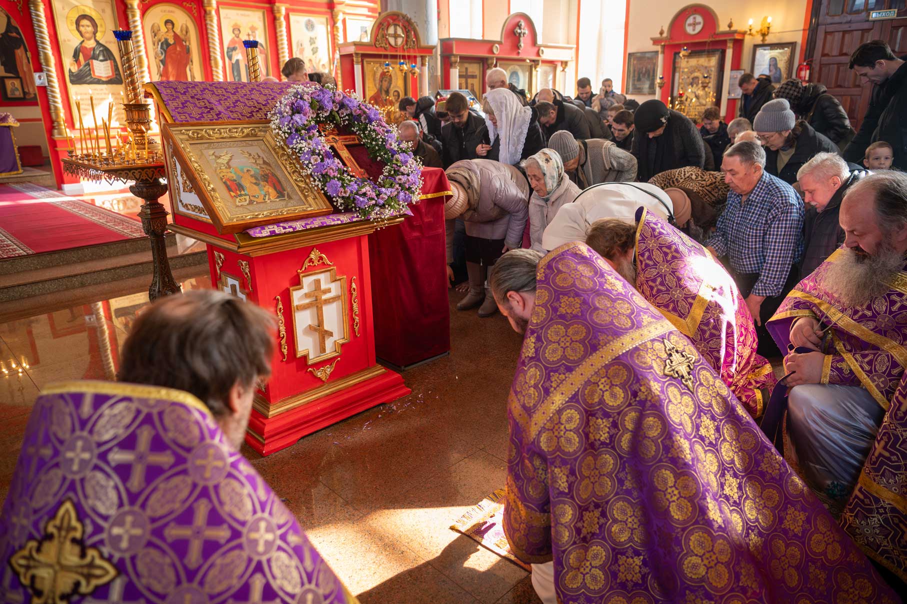Накануне, в субботу, было совершено Всенощное бдение с особым чином выноса Креста Господня из алтаря в центр храма. Этот чин напоминает о возвышении Креста Христова над миром и Его искупительной жертве. Верующие молитвенно преклонились перед Крестом.
