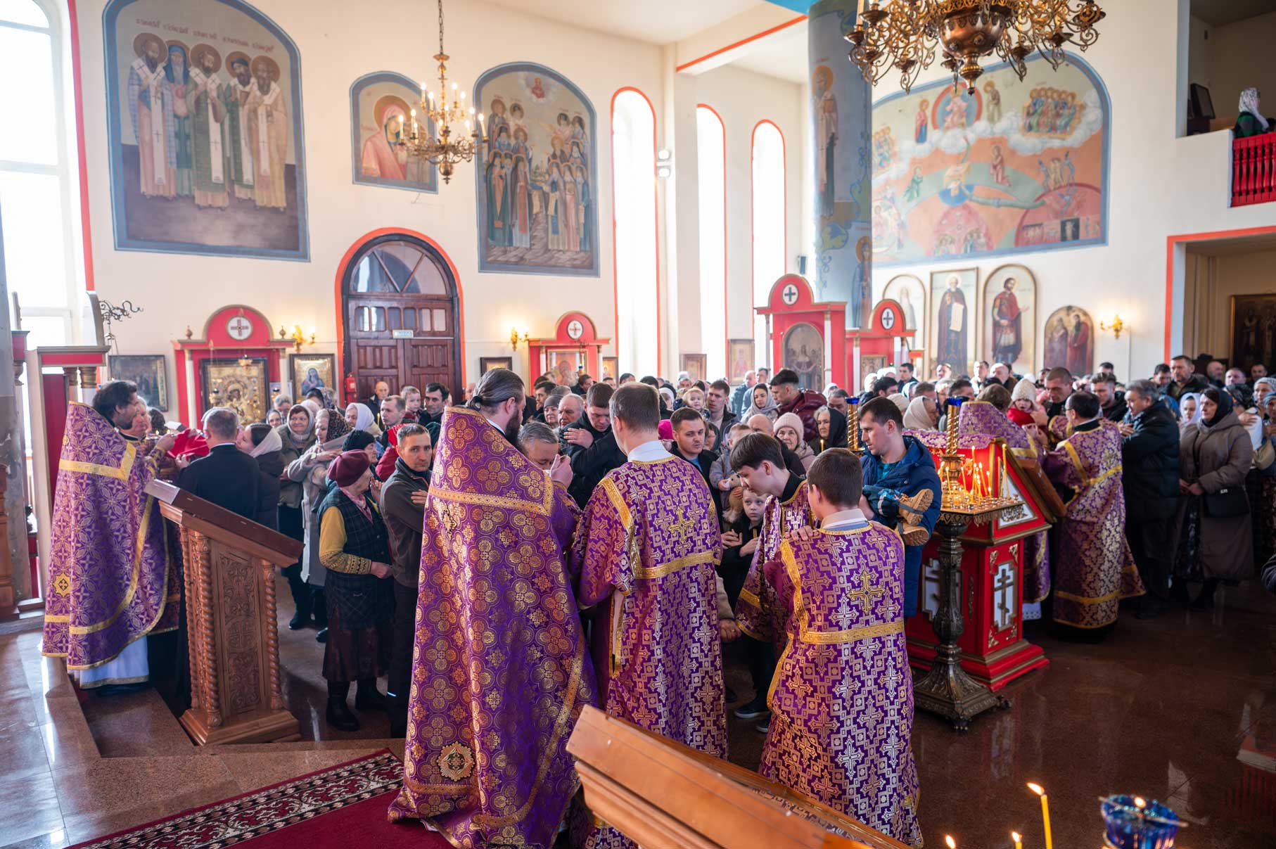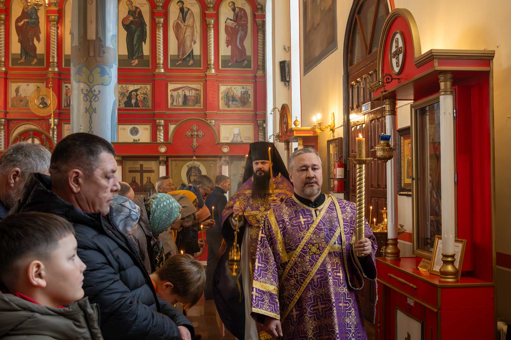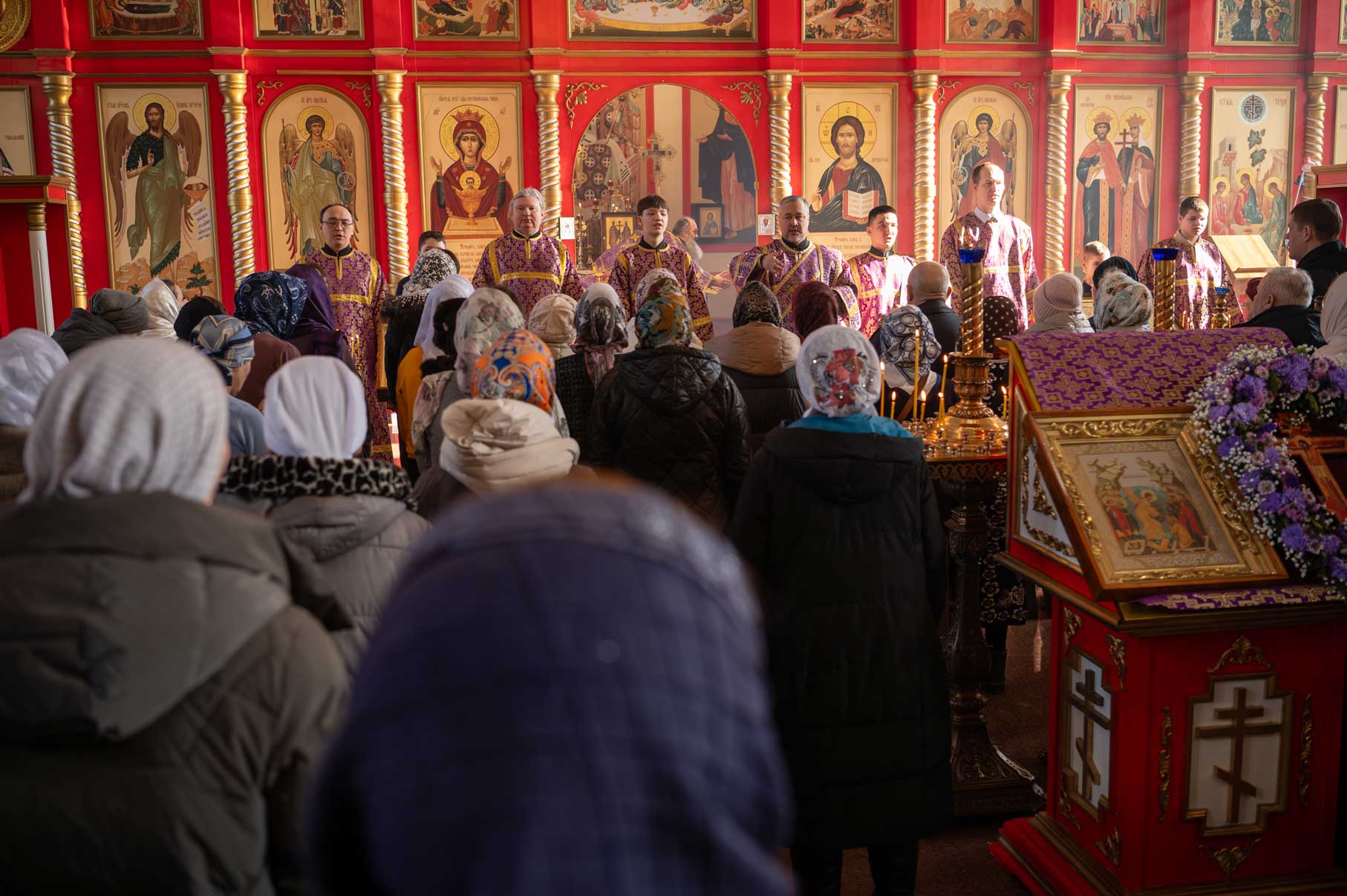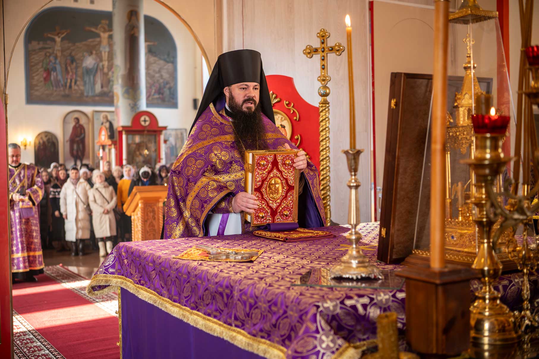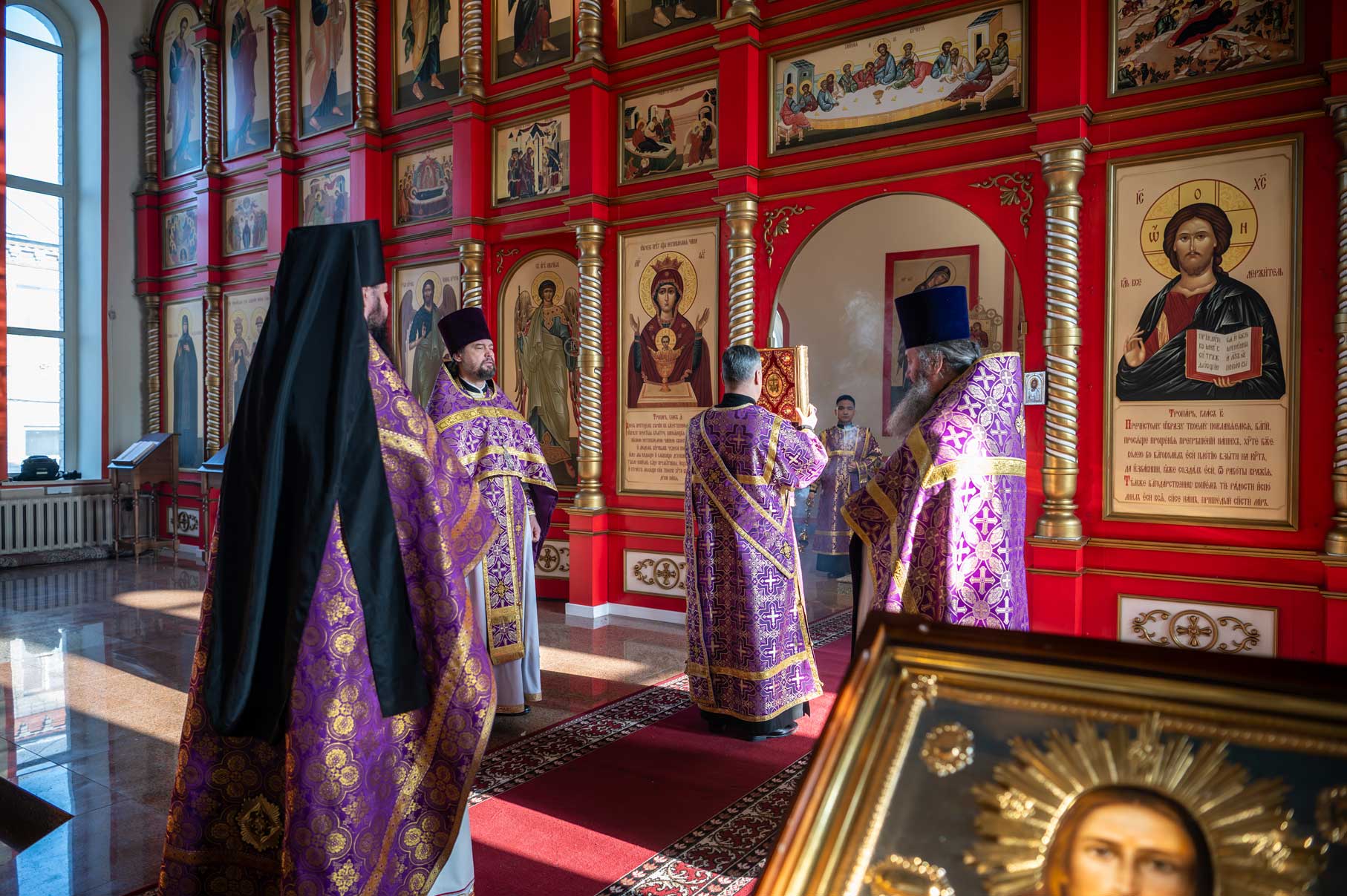 Накануне, в субботу, было совершено Всенощное бдение с особым чином выноса Креста Господня из алтаря в центр храма. Этот чин напоминает о возвышении Креста Христова над миром и Его искупительной жертве. Верующие молитвенно преклонились перед Крестом.
