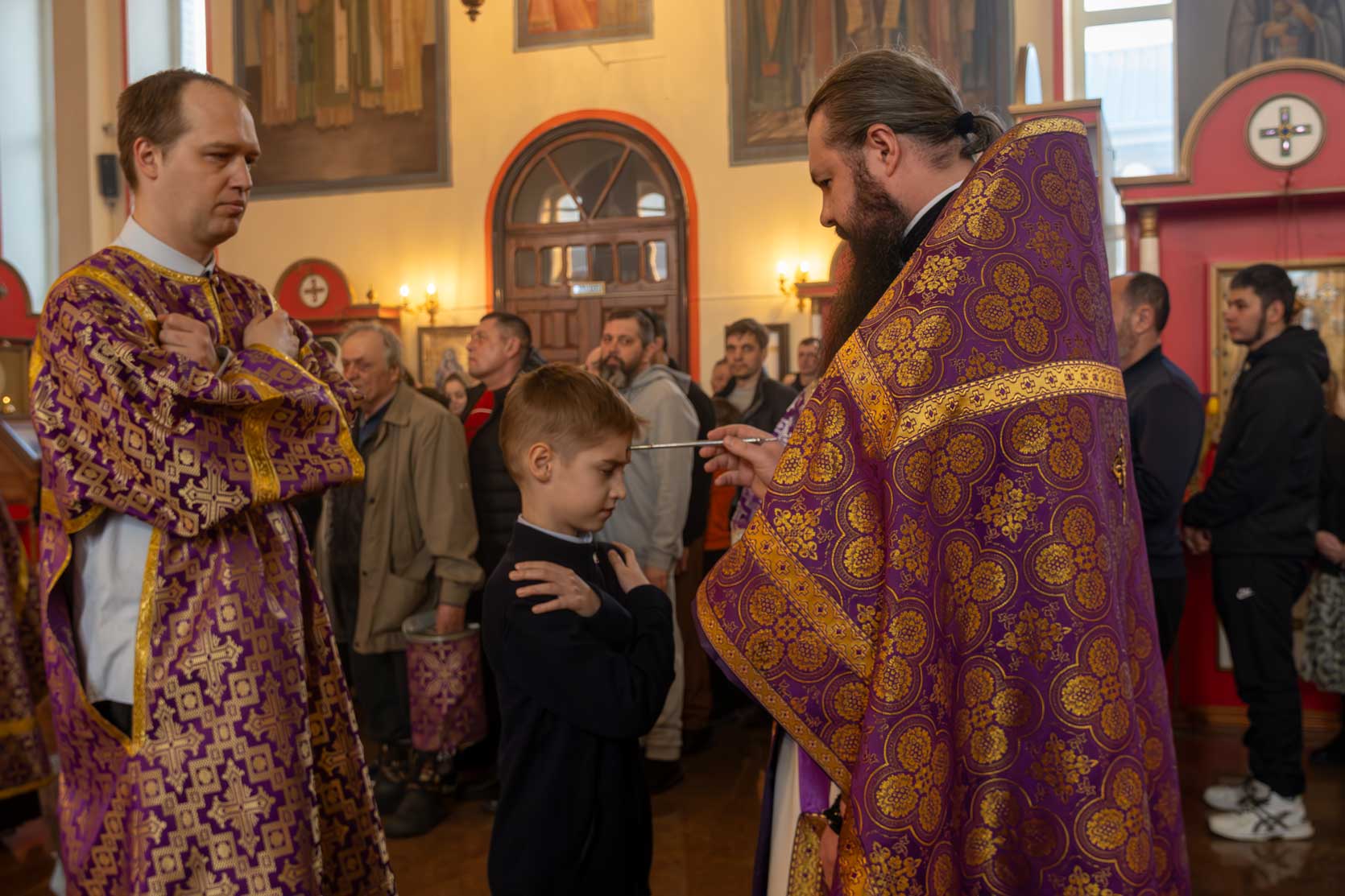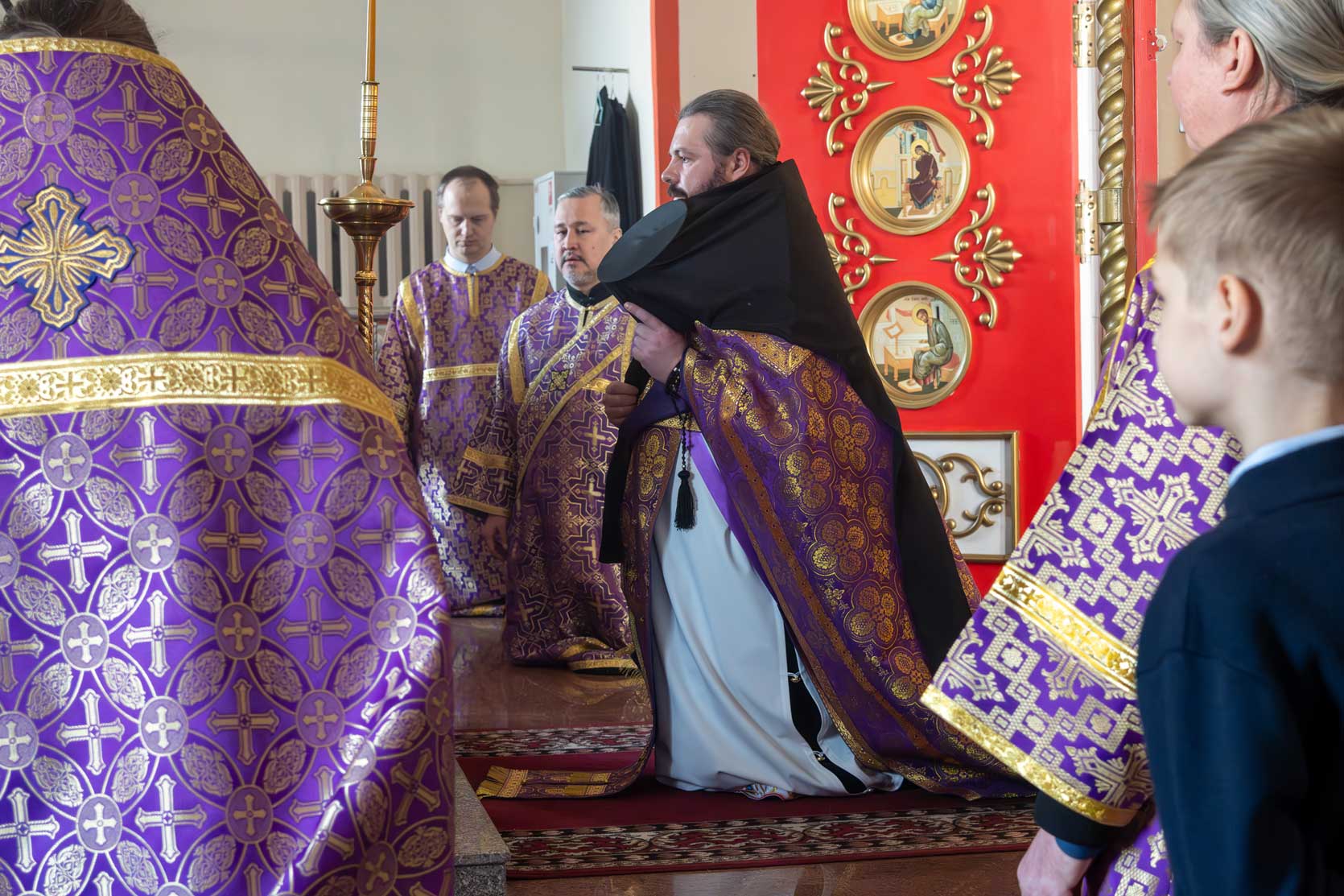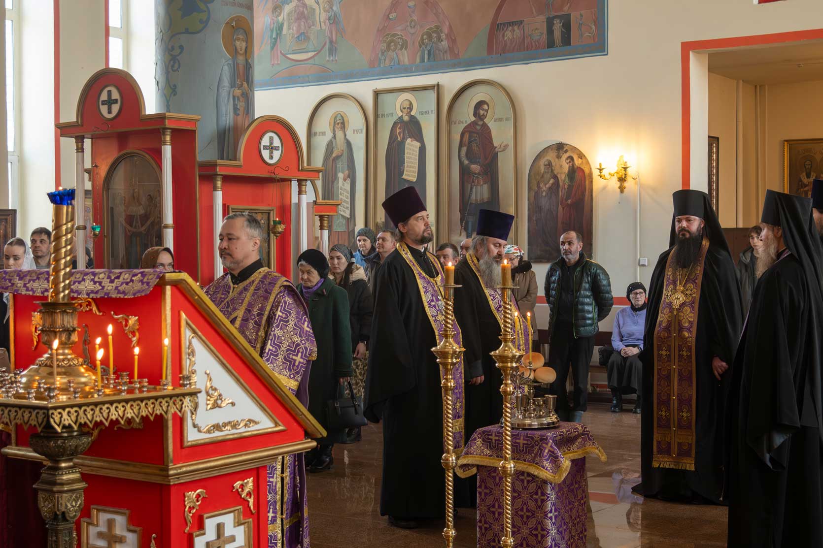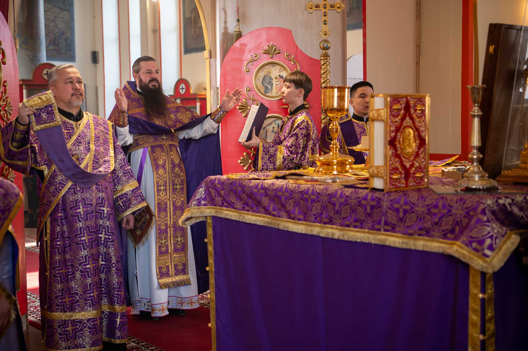 Накануне, в субботу, было совершено Всенощное бдение с особым чином выноса Креста Господня из алтаря в центр храма. Этот чин напоминает о возвышении Креста Христова над миром и Его искупительной жертве. Верующие молитвенно преклонились перед Крестом.